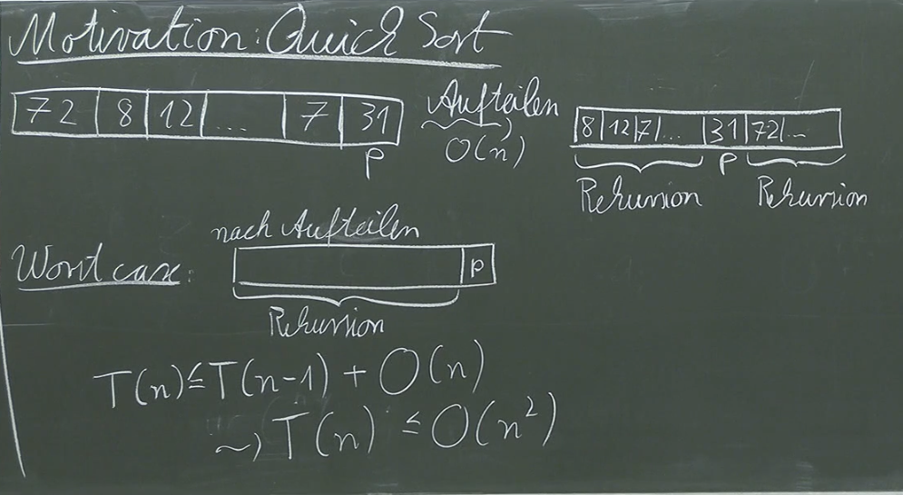 Recall that Quicksort’s worst-case time complexity is . This occurs when the pivot selection consistently results in highly unbalanced partitions (e.g., repeatedly choosing the smallest or largest element). However, if the pivot is chosen randomly, the average runtime complexity is .