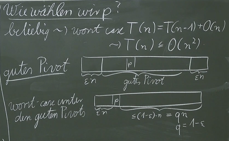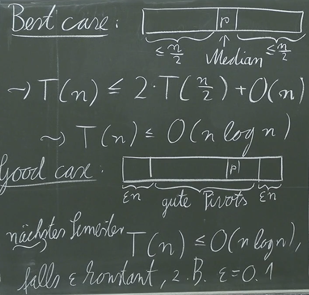 The best-case scenario for Quicksort arises when the exact median is selected as the pivot, leading to perfectly balanced partitions and a runtime of . Further analysis, to be covered in a subsequent course (AnW), will demonstrate that selecting a pivot from a range of values near the median can still maintain an average-case time complexity of .