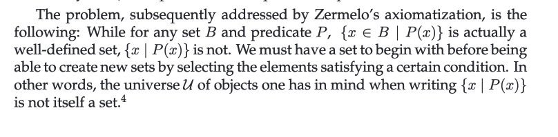 Early, “naive” set theory operated on the intuitive idea that any property could be used to define a set. This principle, known as unrestricted comprehension, led directly to contradictions like Russell’s Paradox. The paradox arises when considering the set . The existence of such a set is logically impossible. Similarly, the concept of a Universal Set, , a set containing all possible sets, also leads to this paradox.