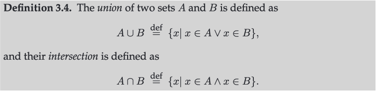 - Union (): The union of two sets and , denoted , is the set containing all elements that are in either , , or both.