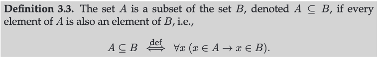 - Subset (): Set is a subset of set (denoted ) if every element of is also an element of .