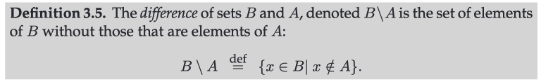 - Difference (- or \): The difference of two sets and , denoted , is the set containing all elements that are in but not in .