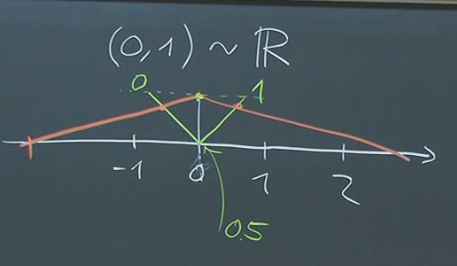 Now, if we project lines from the point to every point on this segment, we can cover all points on the real number line . This geometric mapping can be used to create a bijection between and . Each point in corresponds uniquely to a point on the real line, ensuring that this projection reaches every real number.