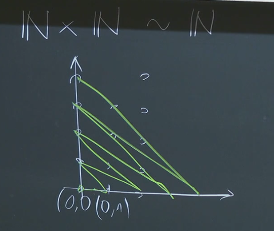The Cartesian product represents the set of all ordered pairs of natural numbers, i.e., . Even though seems “larger” than , we can demonstrate that it is actually countable and has the same cardinality as , i.e., .