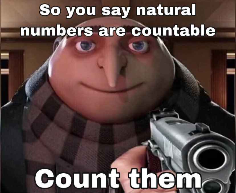 - (): If A is countable and infinite, there exists a surjection from to A. Using the well-ordering principle (explained below), we can construct an injection from A to . Since we have a surjection from to A and an injection from A to , by the Cantor-Bernstein-Schroeder theorem, we have .
