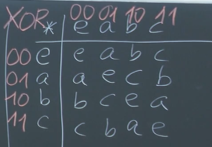 Here, corresponds to 00, to 01, to 10, and to 11. The operation is the bitwise XOR. For example: