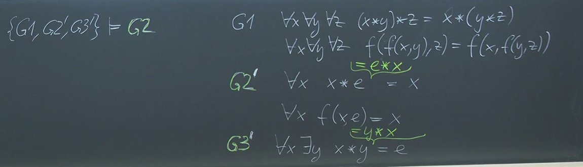 Therefore, even with the simplified axioms G2’ and G3’, we can derive the full properties of the identity element and inverse elements, demonstrating that the standard presentation contains redundancy.