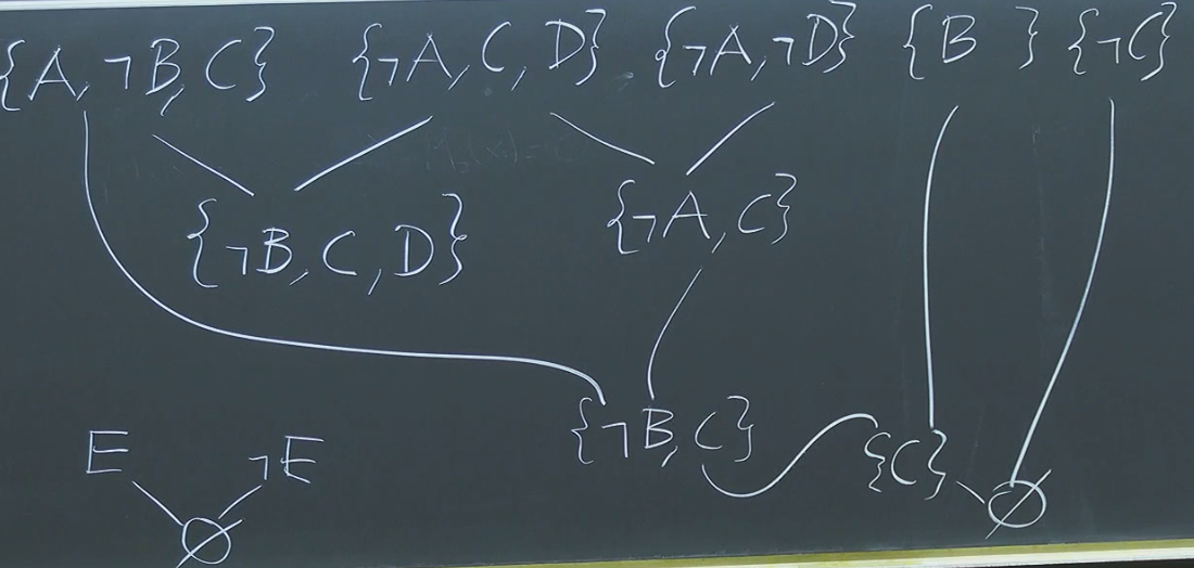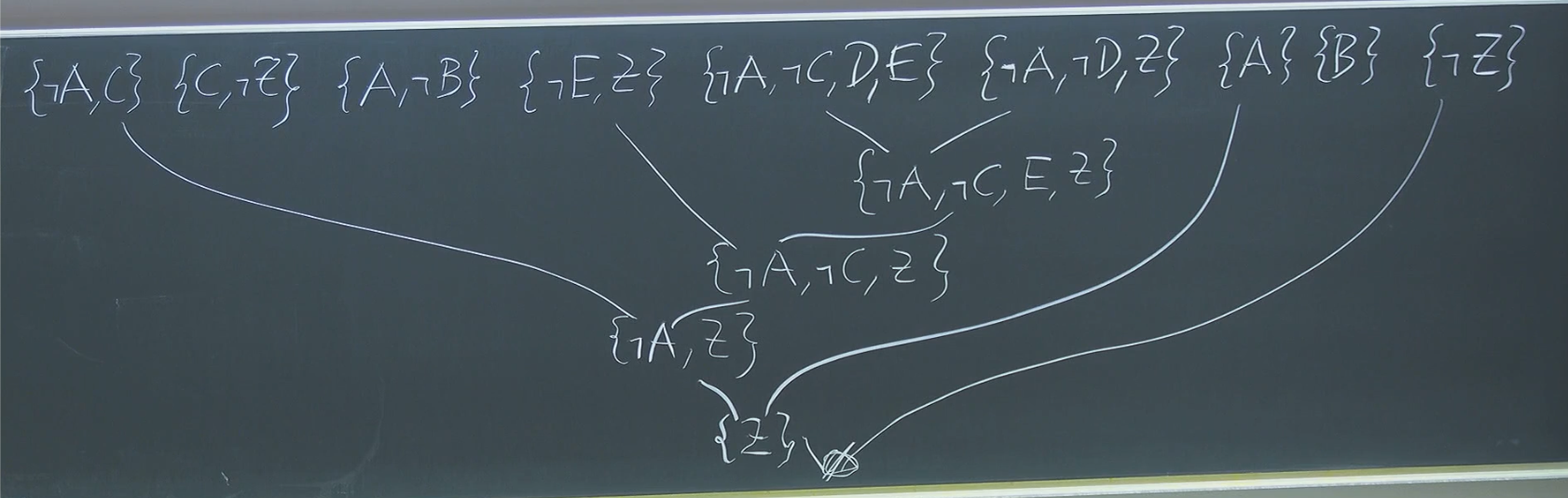 Now we can apply the resolution rule to this clause set, attempting to derive the empty clause. If we succeed, we’ve proven that the original formulas entail .