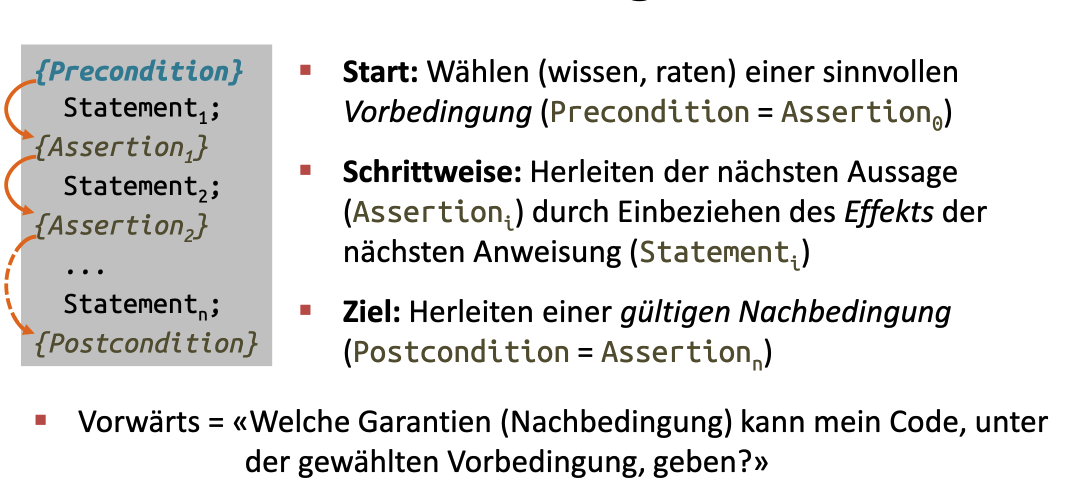 Starts with the precondition and traces the program’s execution, deriving assertions after each statement until reaching a postcondition. It answers the question: Given this precondition, what postcondition can be guaranteed?