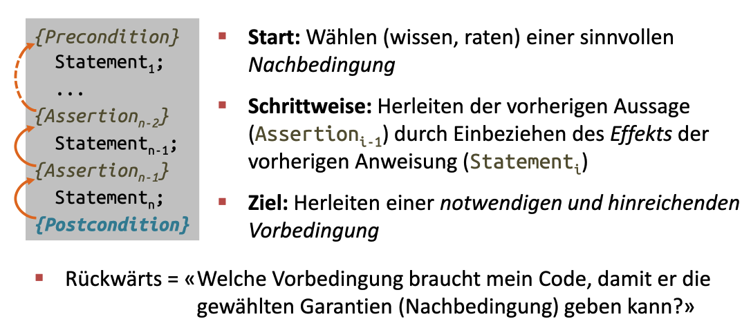 Starts with the desired postcondition and works backward through the program, deriving necessary preconditions for each statement. It answers the question: What precondition is needed to guarantee this postcondition?