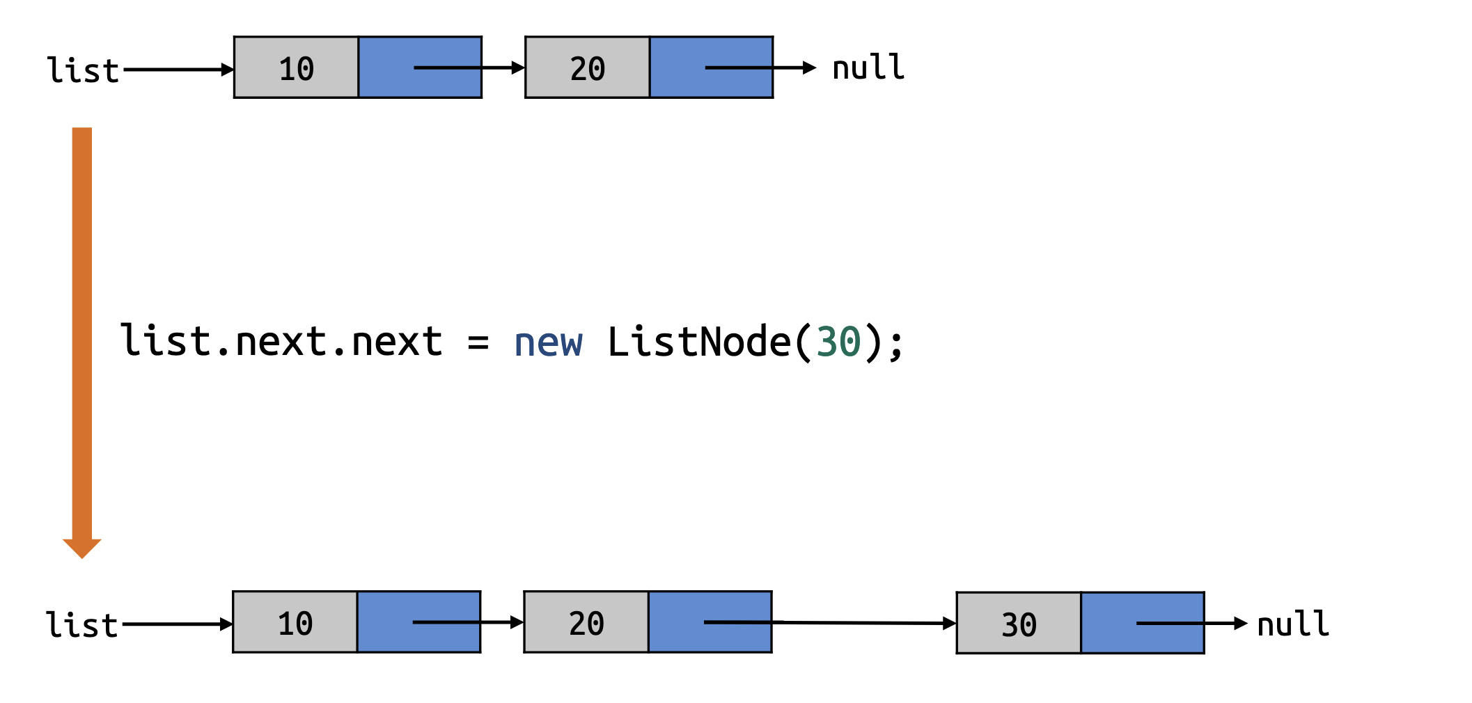 list.next.next = new ListNode(30); // Add 30 at the end2. Adding at the Beginning