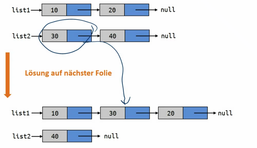 Example: Suppose you have list1: 10 → 20 and list2: 30 → 40. You want to insert the node 30 (the head of list2) after the 10 in list1.