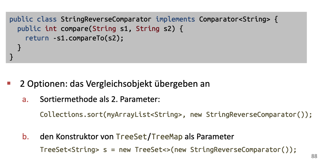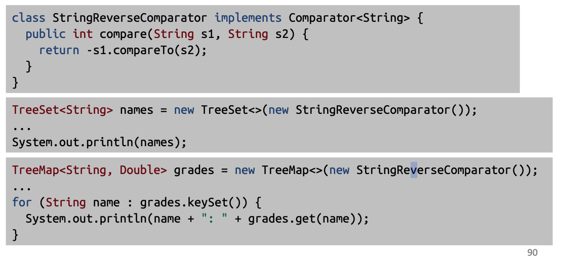 This shows how to use a Comparator with TreeSet and TreeMap at the time of creation to define the desired ordering.