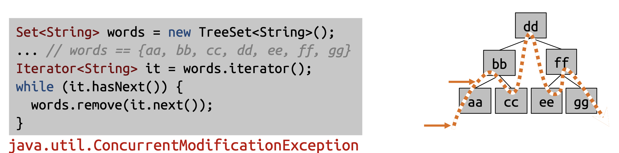 The only way to modify the collection during iteration with Iterator is via the iterator’s remove() method. it.remove() removes the correct element and updates the tree. If words.remove() is used, the tree is changed but it does not notice it and may lead to problems during the next iteration.