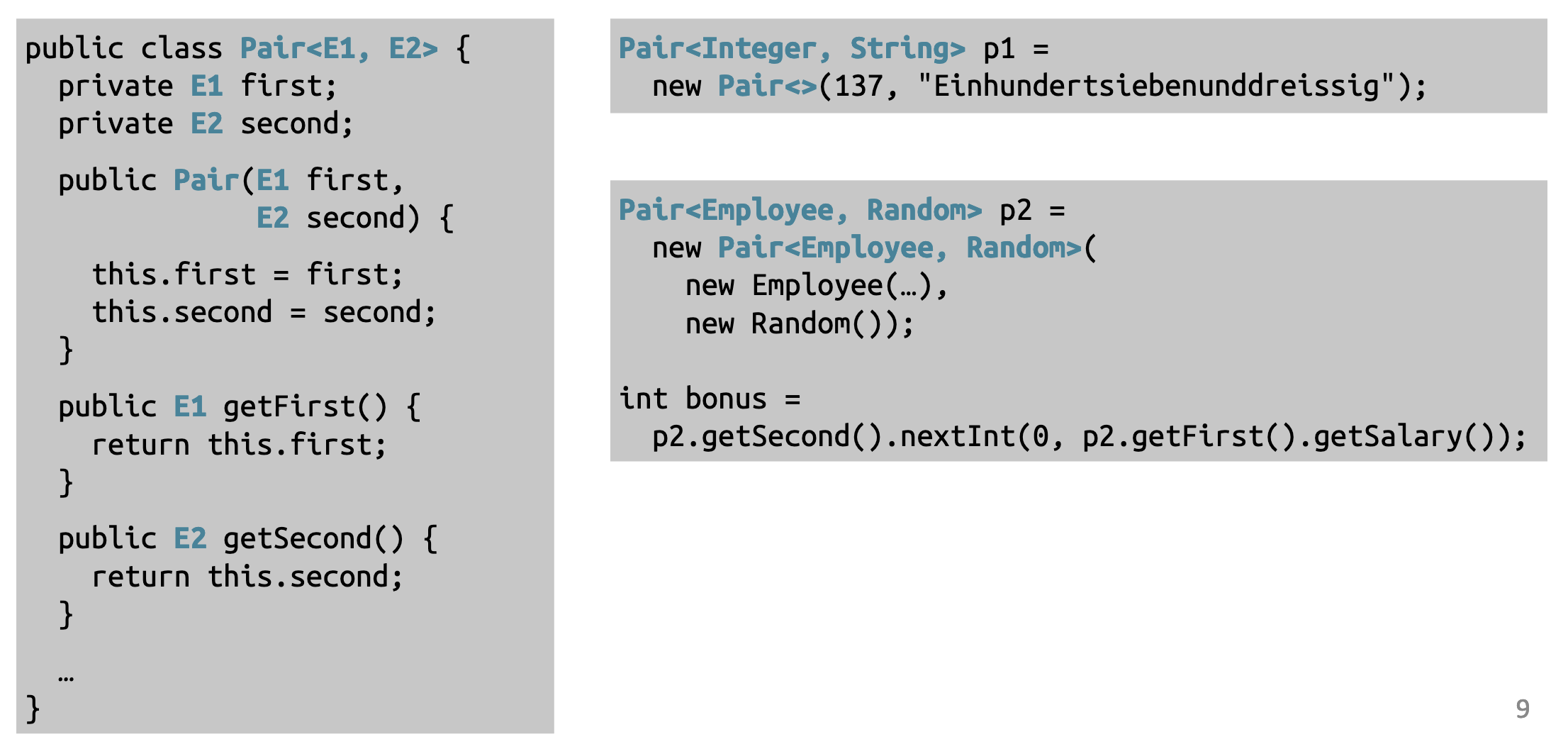 Pair<Integer> p2 = new Pair<Integer>(1, 2); // Initialization with explicit type arguments