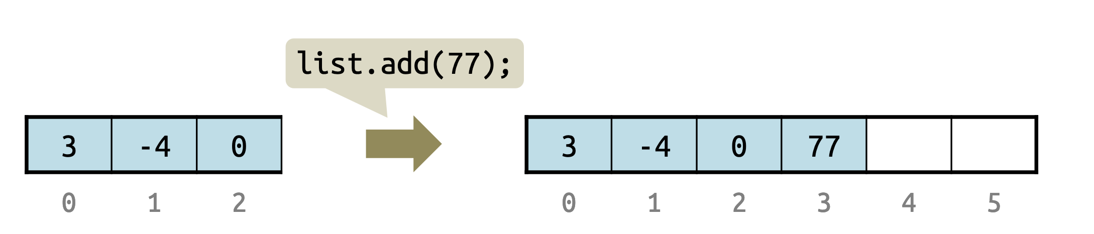 }The add() method appends an element to the end of the list. If the array is full, it calls the private grow() method to double the capacity of the elements array.