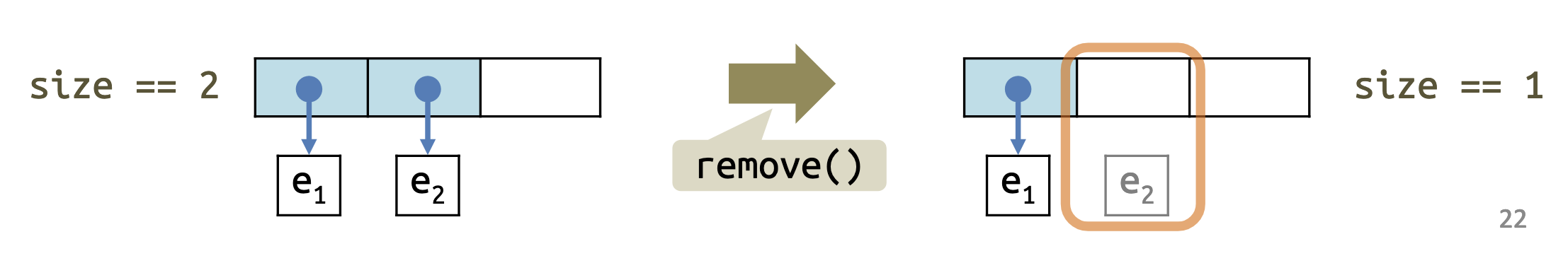 The second version, in addition to reducing size, explicitly sets the last element to null. This crucial step is necessary for garbage collection. Without it, the removed object might still be reachable through the elements array, preventing the garbage collector from reclaiming the memory, potentially causing memory leaks. Though not highly relevant to introductory programming, understanding this is important for sound memory management.