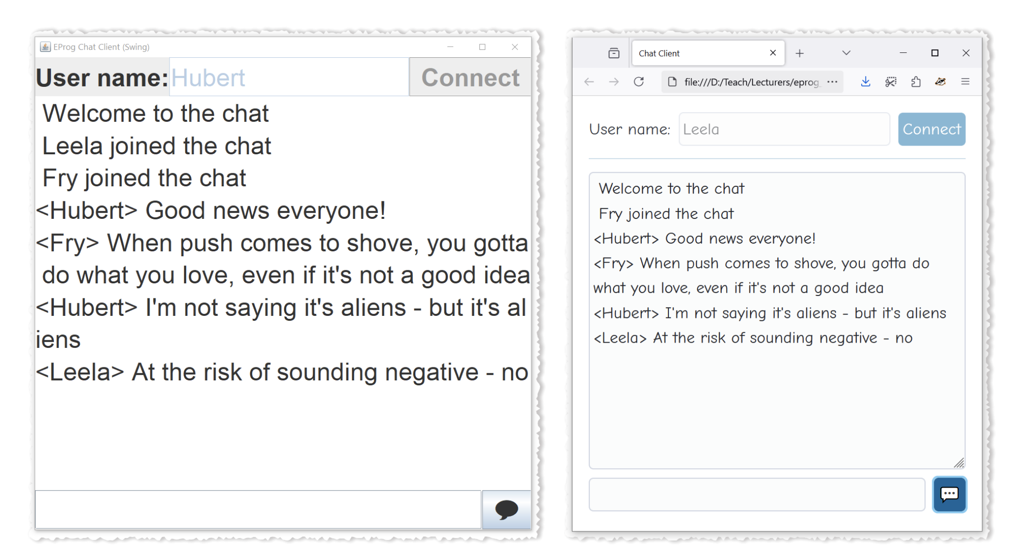 });The addActionListener() method (anonymous method/lambda function) registers a listener that responds to button clicks. Within the listener, a new Message is created and sent to the server, and message field is cleared.