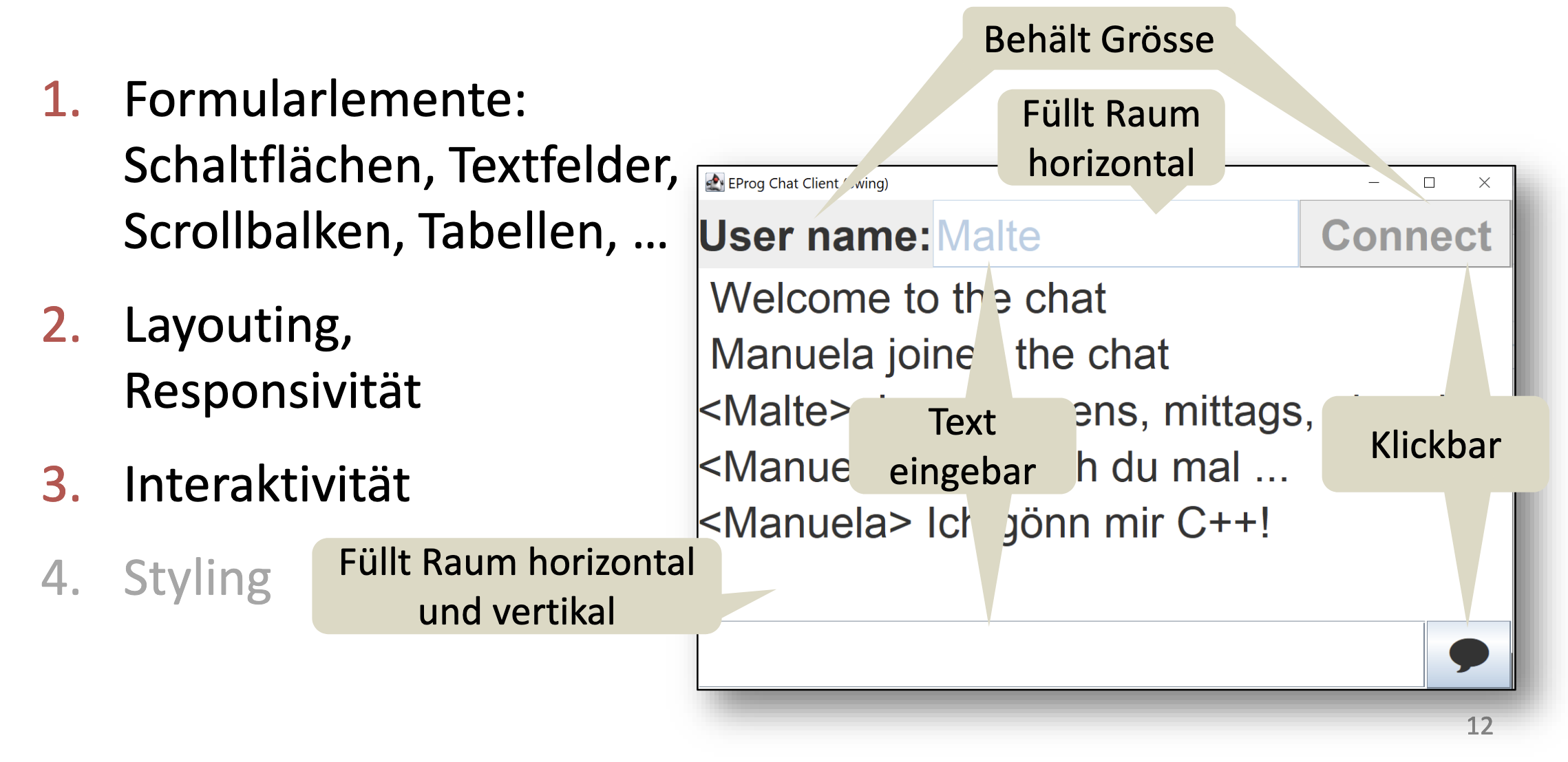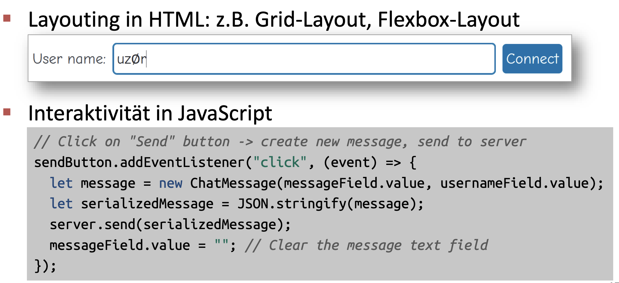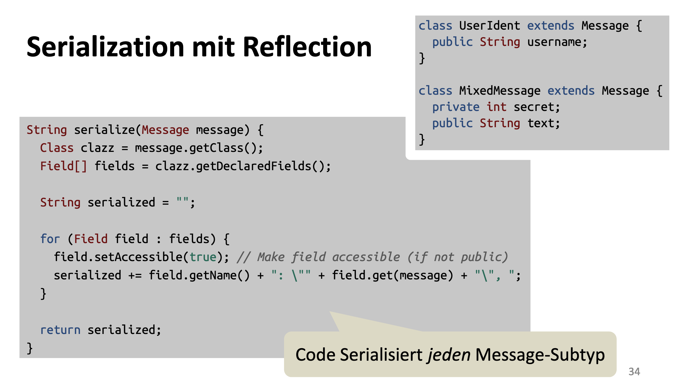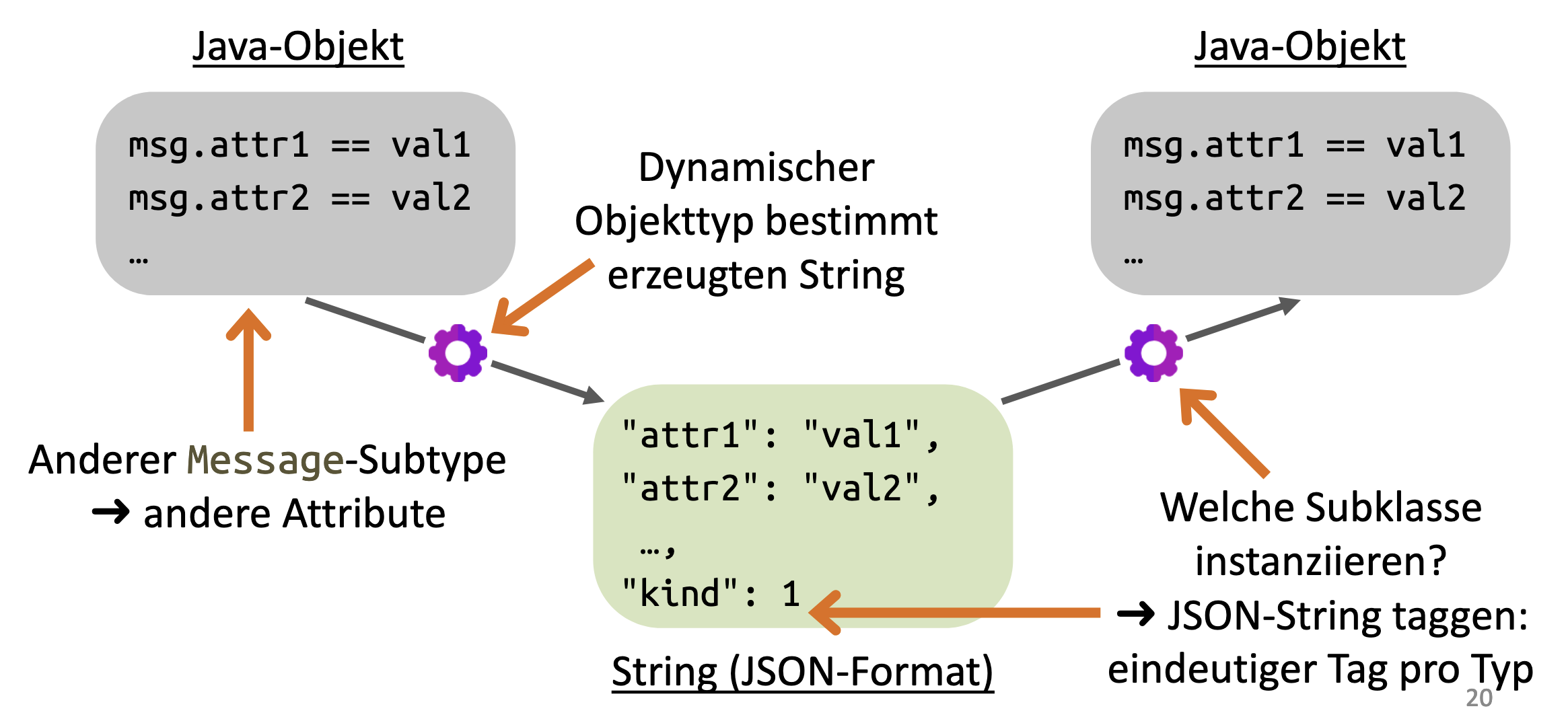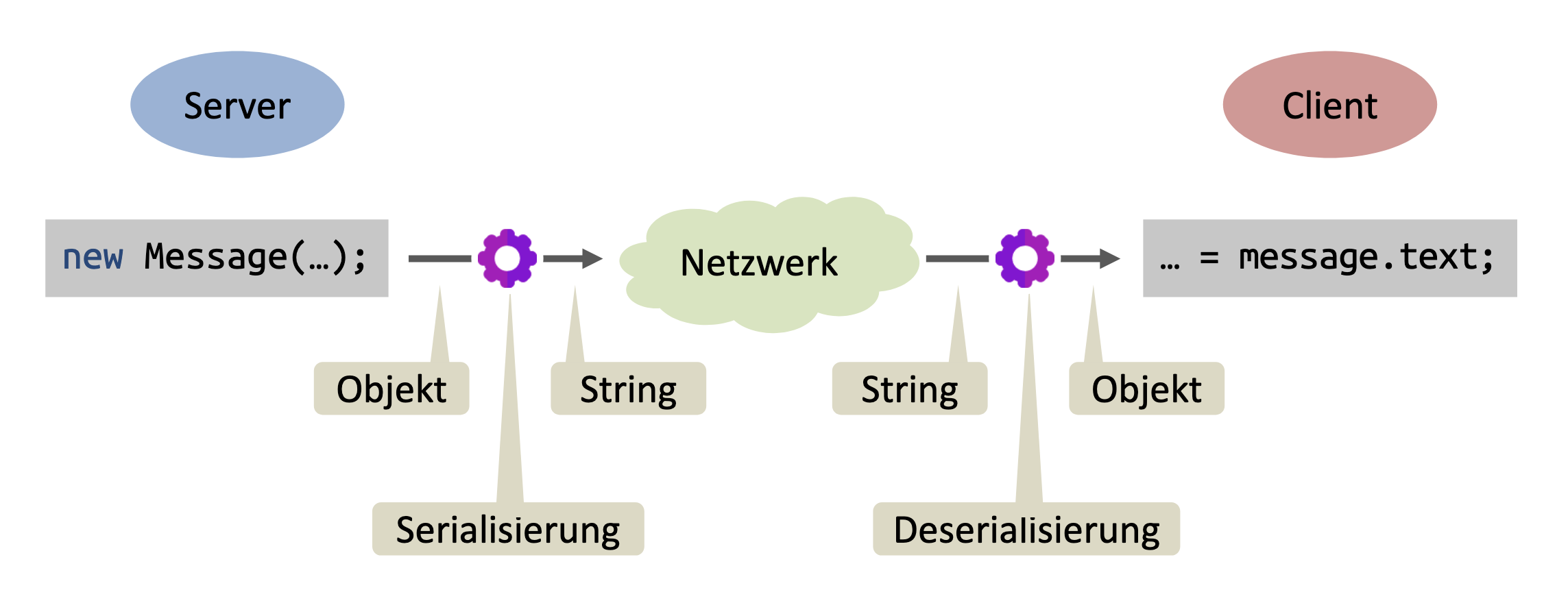 - Message Handling (Nachrichten): Uses (de)serialization to convert messages (objects) to strings and vice-versa for network transmission.
