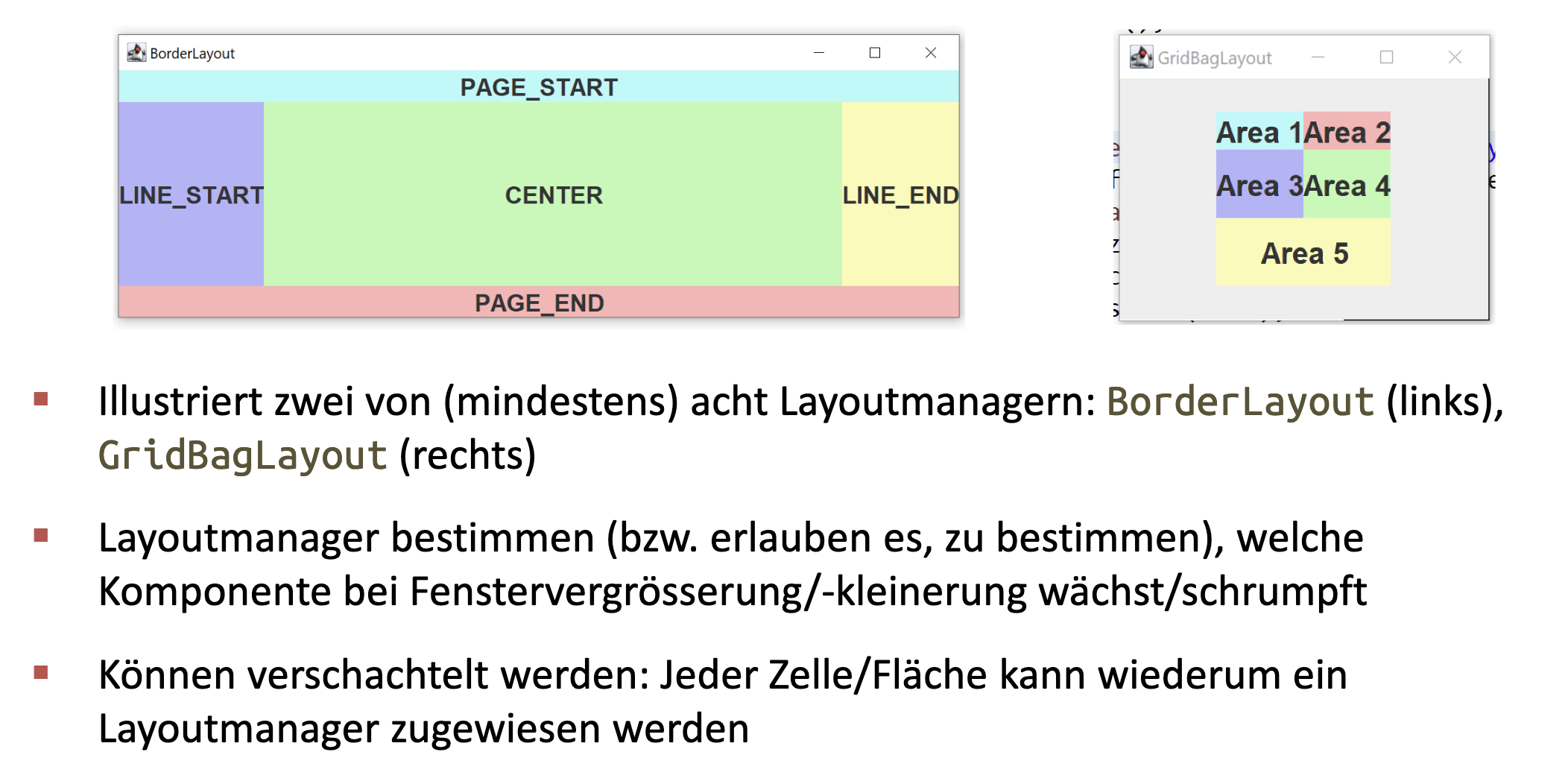 Swing offers several layout managers (at least eight). Here’s an illustration of BorderLayout (used in the previous example) and GridBagLayout: