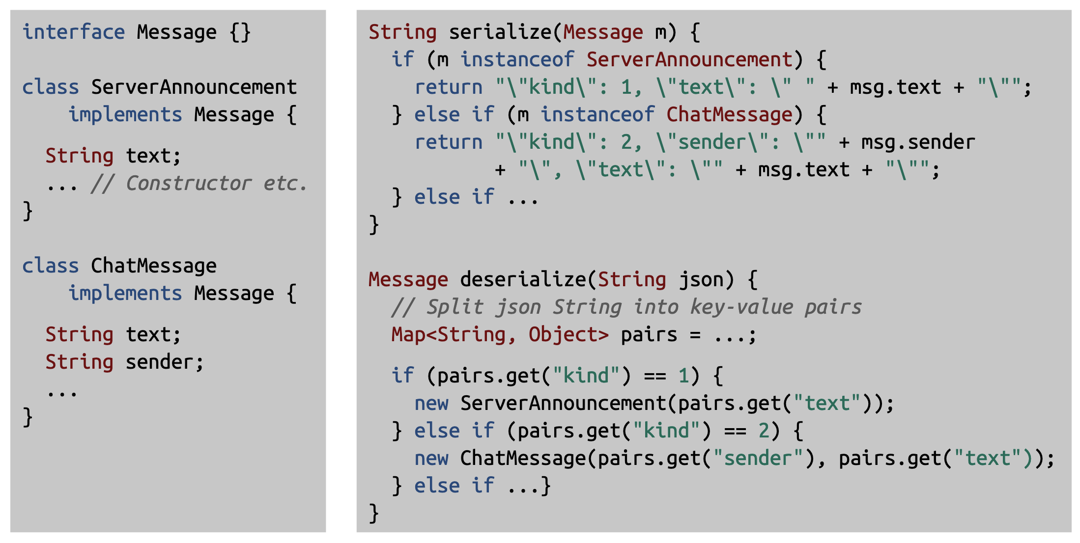- (De)Serialization: Converting objects to/from string representations, as seen in the chat example.