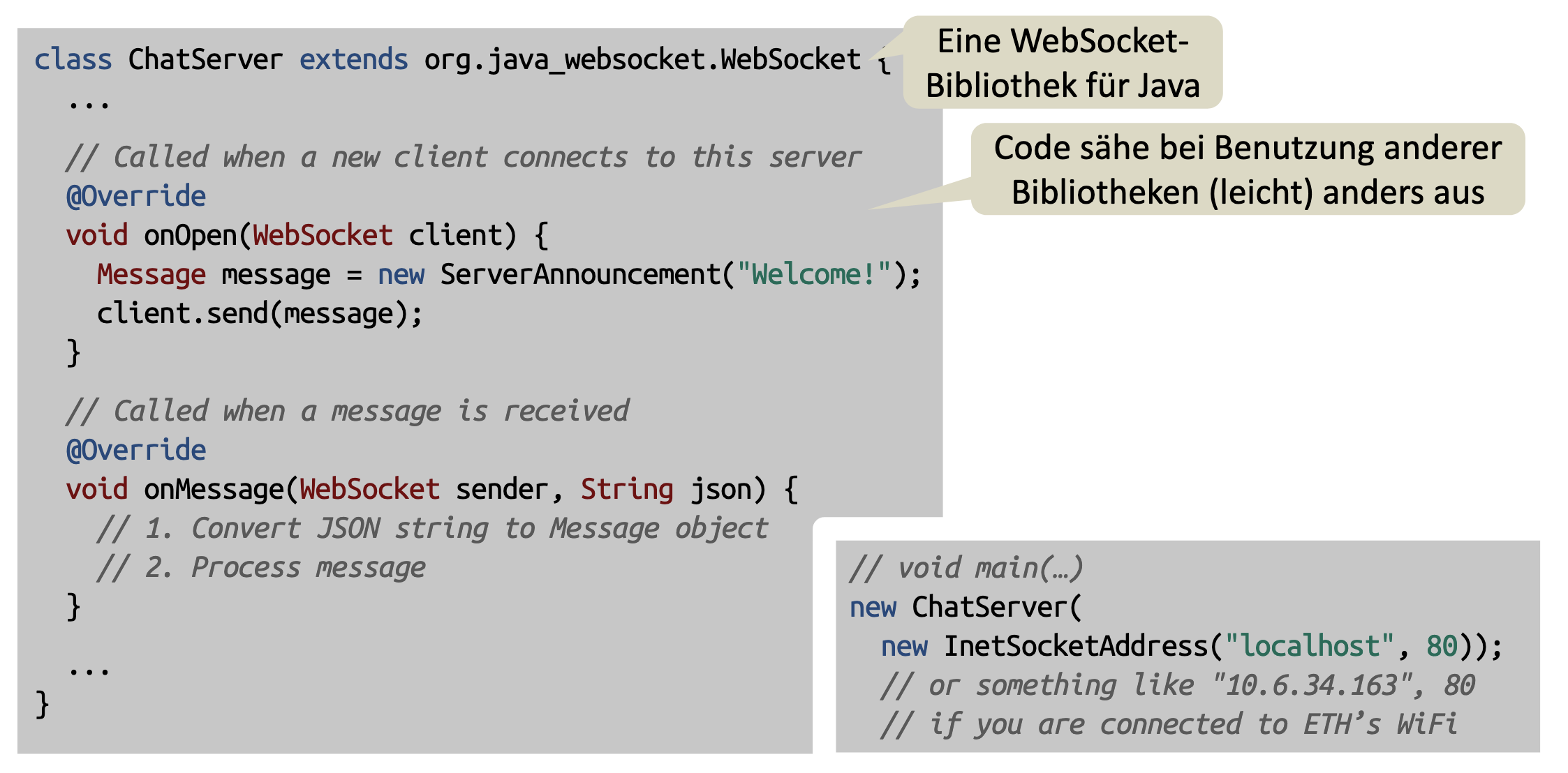 This code snippet shows how the chat server handles new client connections and incoming messages using WebSockets. Libraries, such as org.java_websocket, provide framework code for WebSocket specific operations.