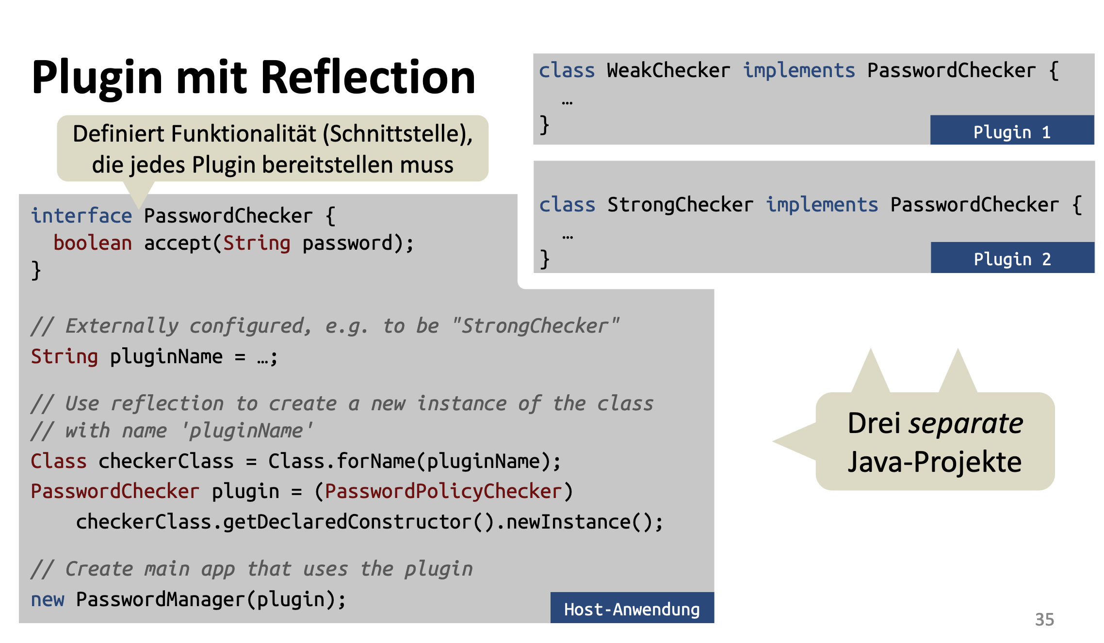 The application can dynamically load and use different PasswordChecker plugins without needing to know about them at compile time. Kinda insane but cool though…