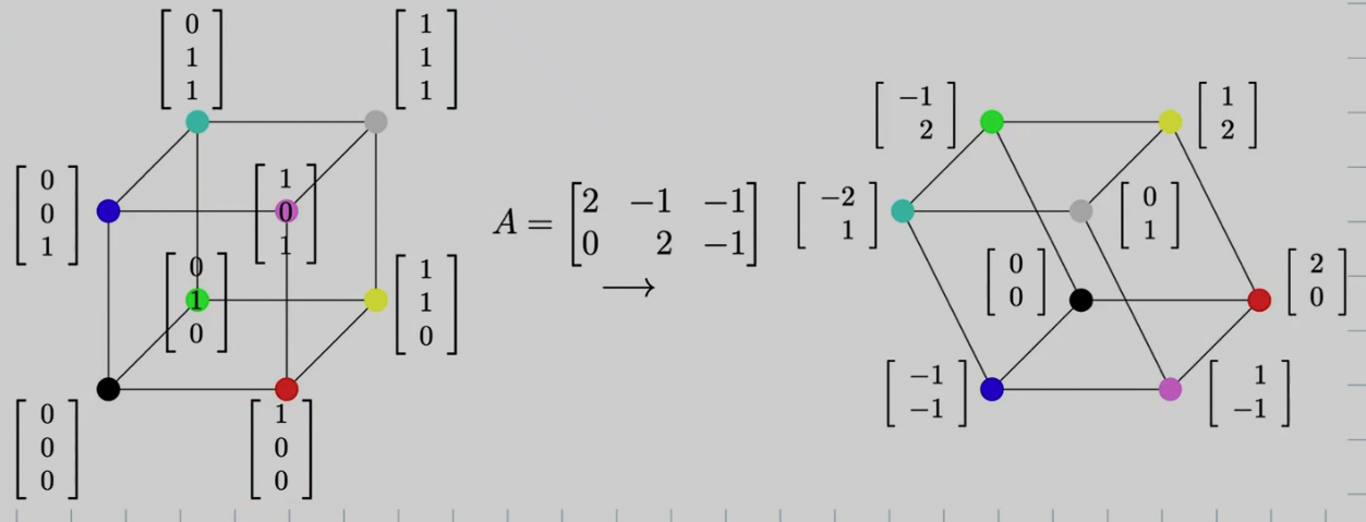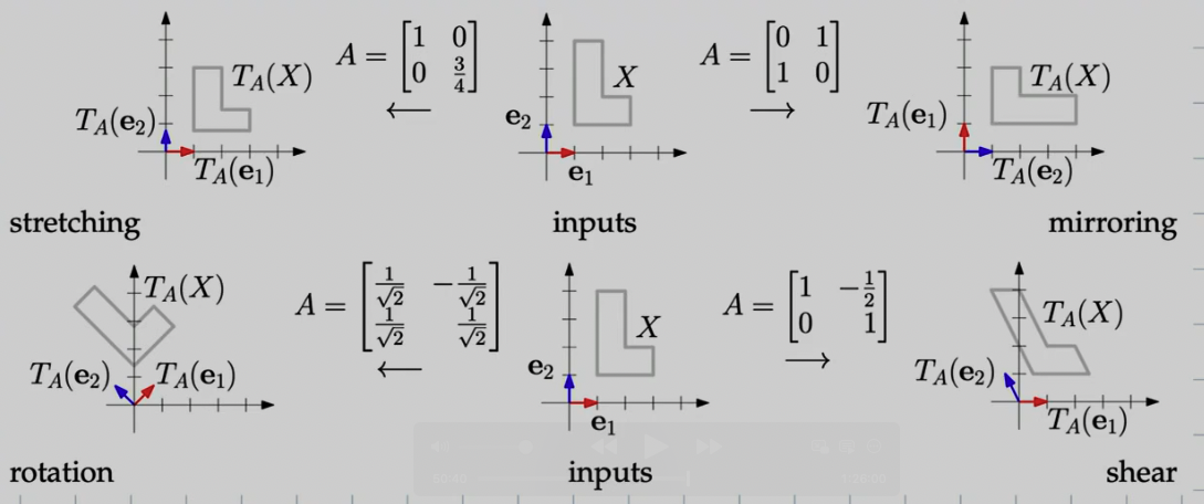 A simple way to think of what’s happening is to look at the unit vectors start and end position. 2D matrices allow you to operate on vectors in RR2 distort them by: stretching, mirroring, rotating, shearing,…