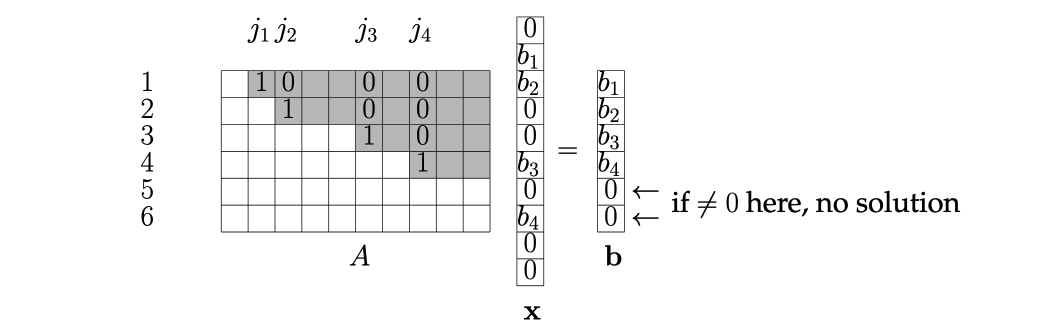 - If for some : no solution! (since any linear combination of the column vectors of will return a in those columns)