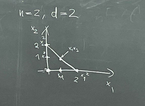- In two variables (x and y) with degree at most 2, we can take the set of monomials: . Any polynomial with degree at most 2 can be formed by a linear combination of these monomials.
