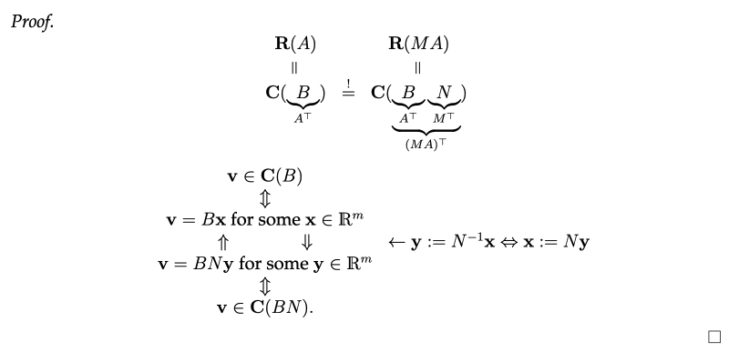 Introduce M and relate to the row space of MA: To connect to the row space of , we introduce the invertible matrix . Since is invertible, its inverse exists. Let’s introduce a new vector related to by the equation .