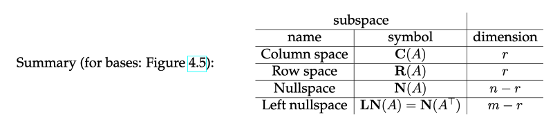 Column Space (): The column space of , denoted , is the subspace of spanned by the columns of . In other words, consists of all linear combinations of the columns of .