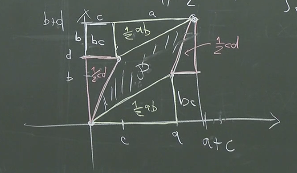 We can calculate the area of by finding the area of the large rectangle enclosing the parallelogram and subtracting the areas of the four triangles and two small rectangles: (Note that two of the triangles are congruent, and the other two are also congruent).