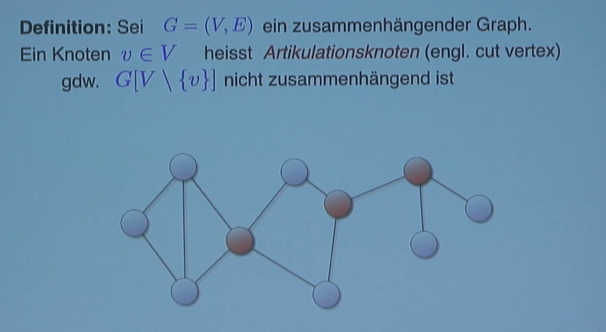 A cut vertex (or articulation vertex) is a vertex in a connected graph whose removal (along with its incident edges) disconnects the graph. In other words, if is a connected graph, and is a cut vertex, then the induced subgraph is not connected. A graph that is 1-connected may have cut vertices, but a graph that is not connected has, by definition, no path between some pairs of nodes, even before any vertices are removed. A graph with -connectivity, where , has no cut vertices.