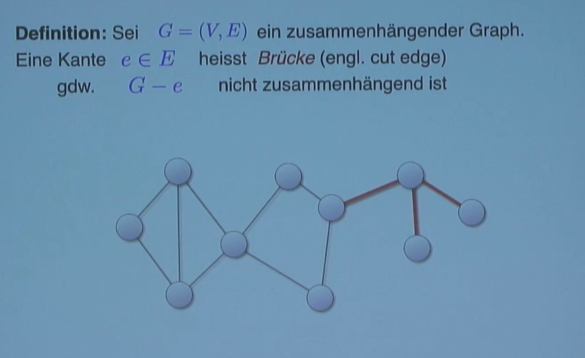 A cut edge (or bridge) is an edge in a connected graph whose removal disconnects the graph. If is a connected graph, and is a cut edge, then the graph is not connected. Similar to cut vertices, a graph with -edge-connectivity, where , has no cut edges.