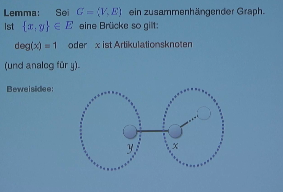 Lemma: Let be a connected graph. If an edge is a bridge, then either the degree of is 1 () or is a cut vertex, and the same applies to : either or is a cut vertex. (The converse is not necessarily true).