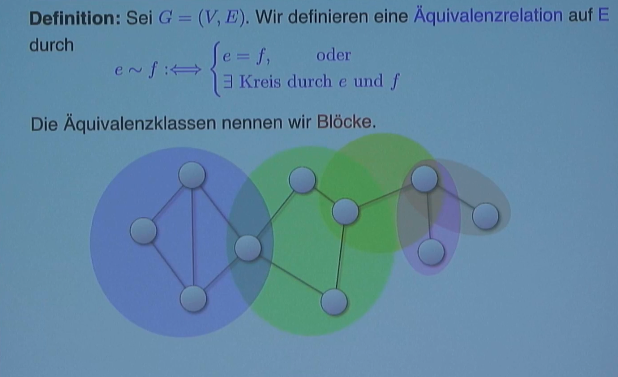 Intuition: Think of blocks as the “biconnected components” of the graph, but defined in terms of edges. If two edges lie on a common cycle, they are “strongly connected” in the sense that removing either one of them won’t disconnect the graph. A block is a maximal set of edges with this property.