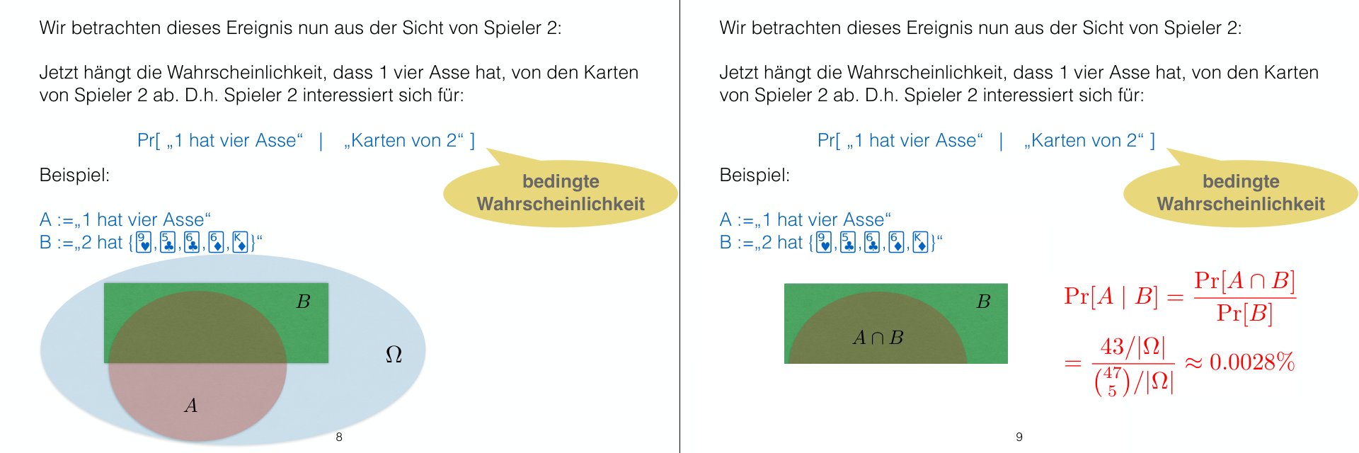 Now, for event (Player 1 has 4 Aces AND Player 2 has their specific hand): Since Player 2 has no Aces, all 4 Aces are still available among the 47 remaining cards. For Player 1 to have 4 Aces, Player 1 must receive all 4 Aces ( way) and 1 more card from the cards that are not Aces and not in Player 2’s hand ( ways). So, there are hands for Player 1 corresponding to .