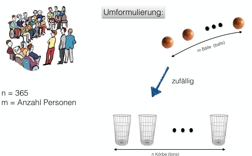It’s easier to calculate the complementary probability: . Let be the number of people (balls) and be the number of possible birthdays (bins).