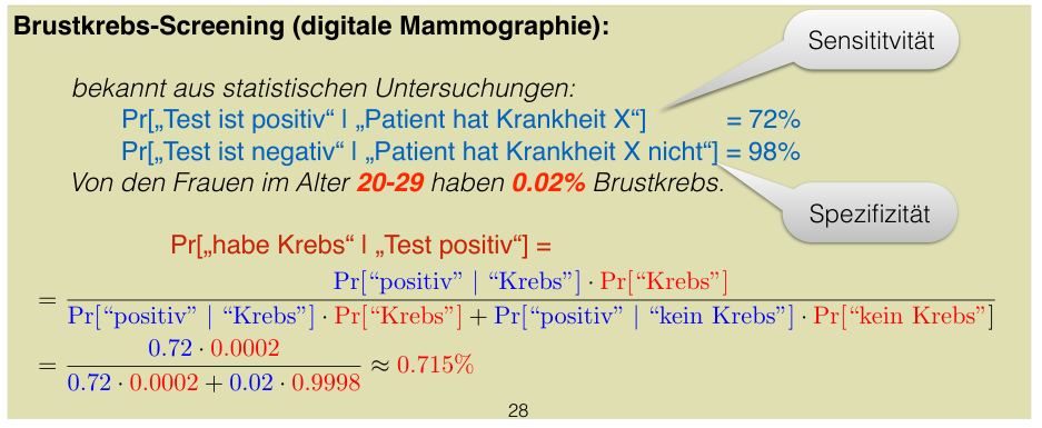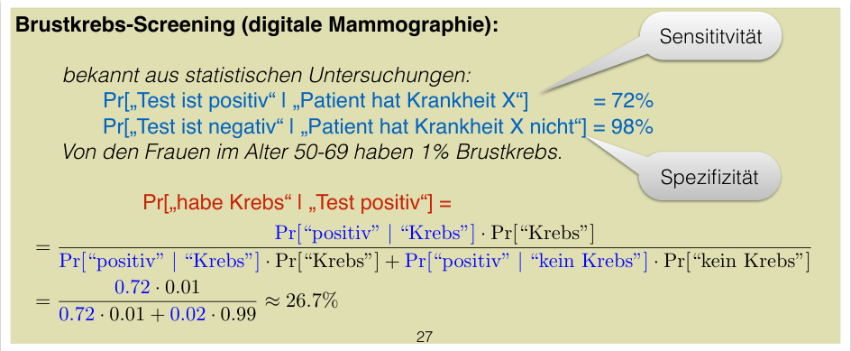 or . Even with a positive test, the probability of having cancer is only 26.7%. This is often counter-intuitive and is known as the base rate fallacy.