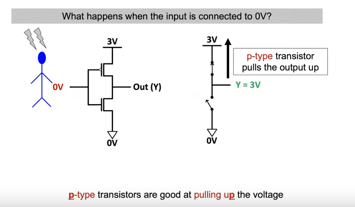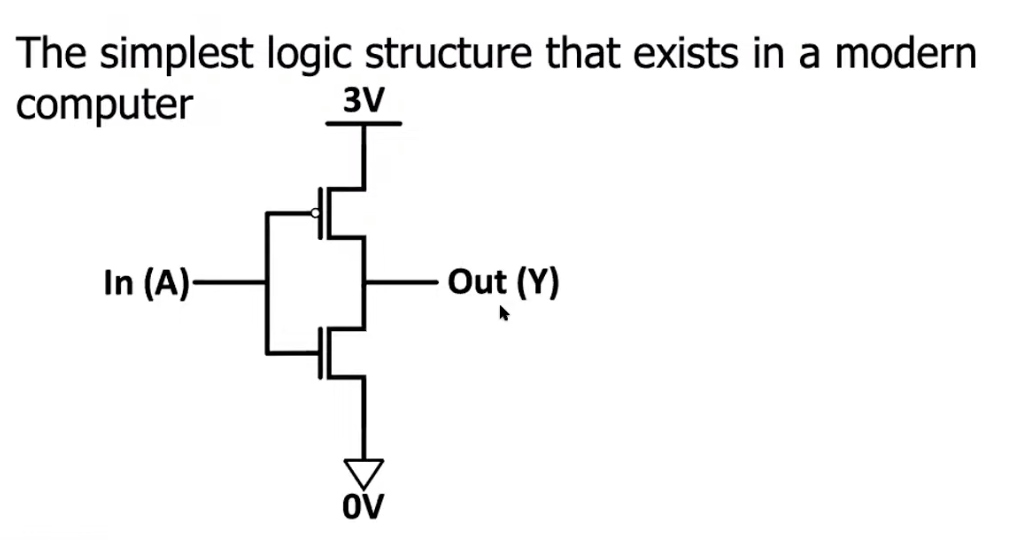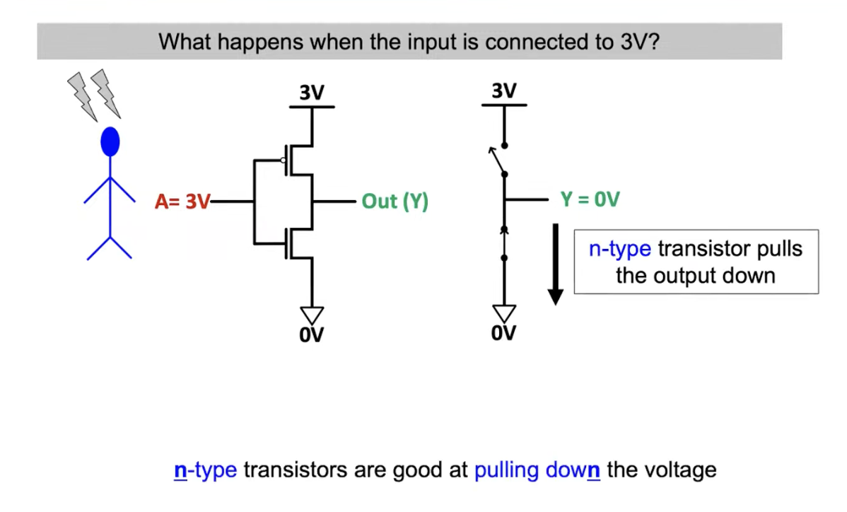 - Input = Low (Logic 0, e.g., 0V): The pMOS transistor turns ON, pulling the output up to the supply voltage (3V). The nMOS transistor turns OFF.