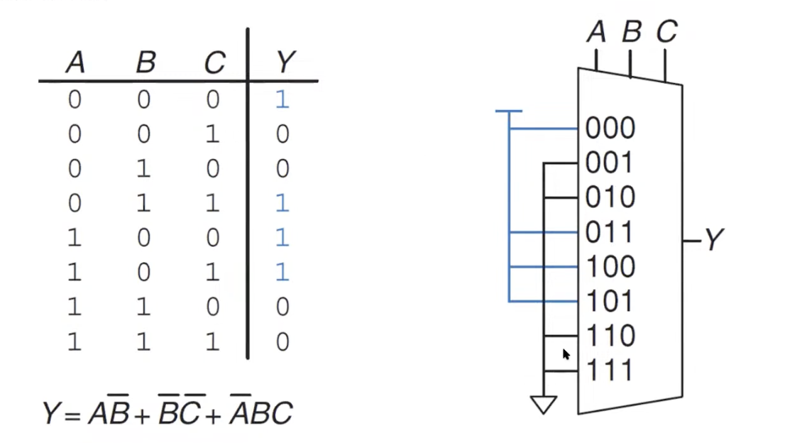 By connecting the data inputs ( to ) to the appropriate logic levels (0 or 1) based on the desired function’s truth table, a MUX can implement any 3-input Boolean function. The select lines (A, B, C) are the function’s inputs.