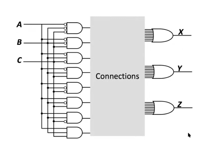 It typically consists of a decoder for inputs followed by an array of AND gates and an array of OR gates.