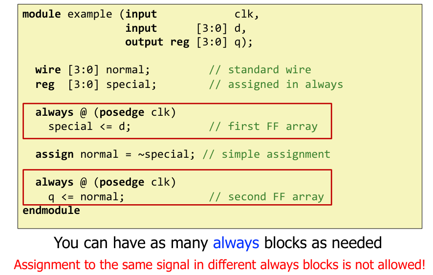 regdoes not necessarily mean a physical register, but indicates a variable that can hold its value between assignments.assignstatements are not used withinalwaysblocks.<=describes a non-blocking assignment.