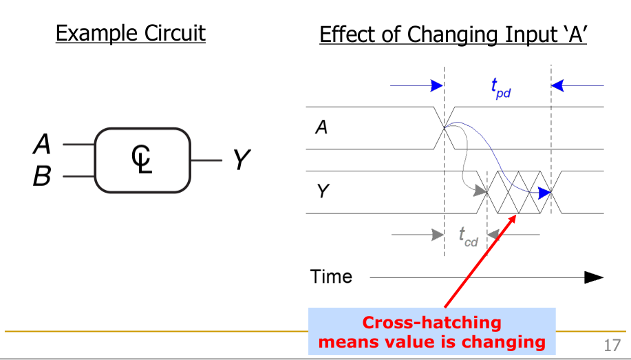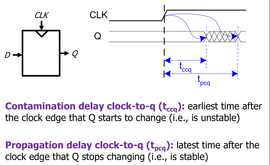- Contamination delay clock-to-q (): Earliest time after the clock edge that Q starts to change (unstable).