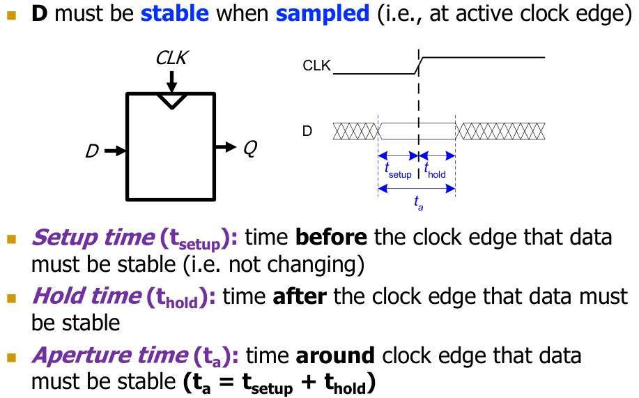 - Aperture time (): Time around the clock edge that data must be stable ().
