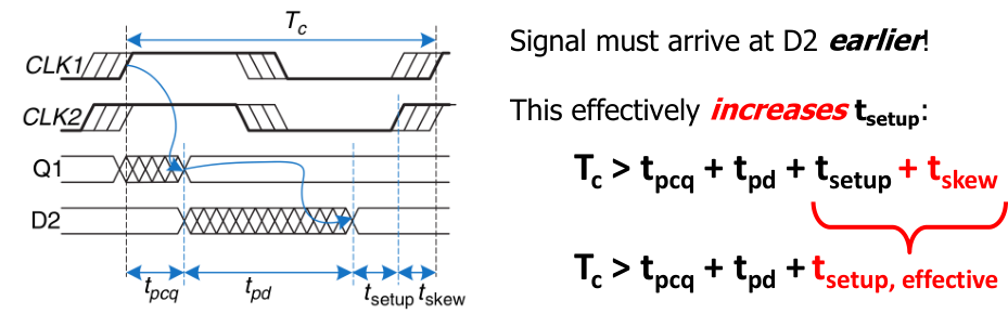 - Clock arrives at R2 after R1, increasing the minimum required delay for combinational logic.