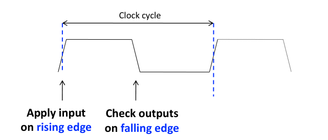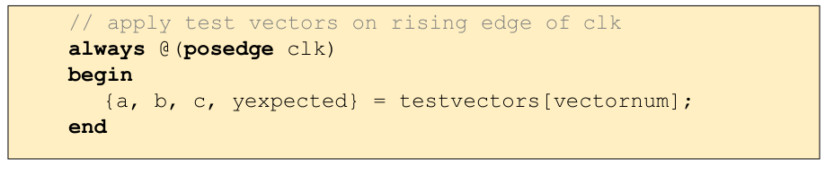 - Testbench with Testvectors Design: A “clock signal” is used to synchronize the application of inputs and the checking of outputs, with one testvector processed per “clock cycle.”