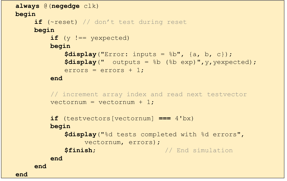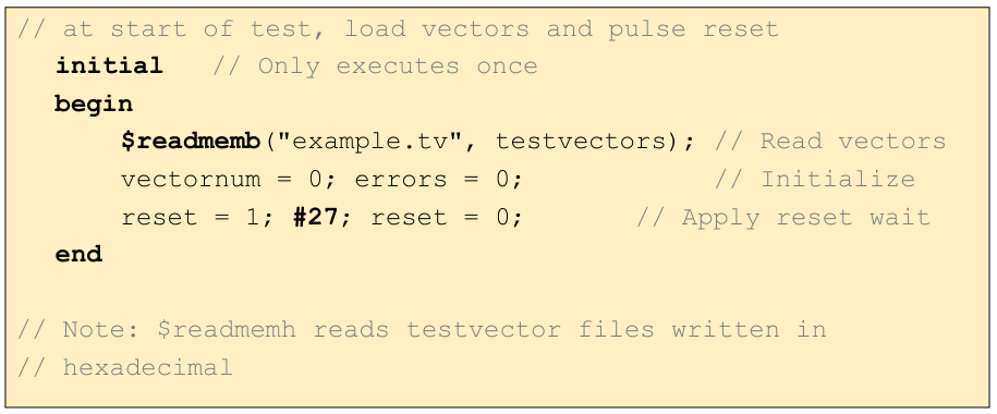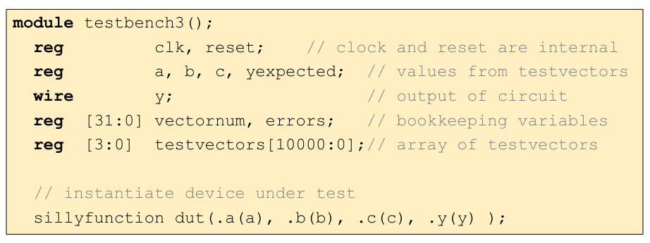testbench3) demonstrates how to read testvectors from a file, apply them to the DUT, and automatically check the outputs.