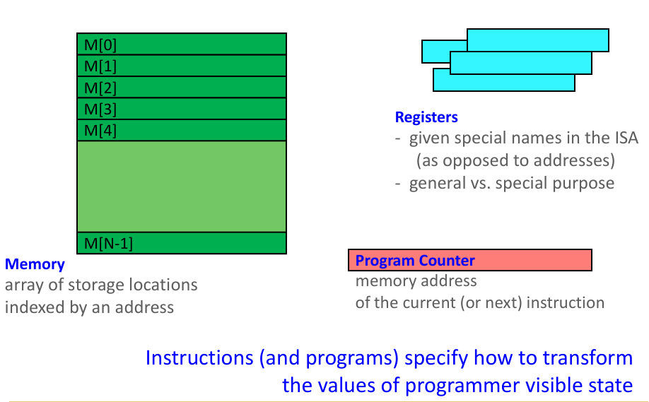 Programmers use instructions to transform the values of this programmer-visible state, effectively controlling the computation.
